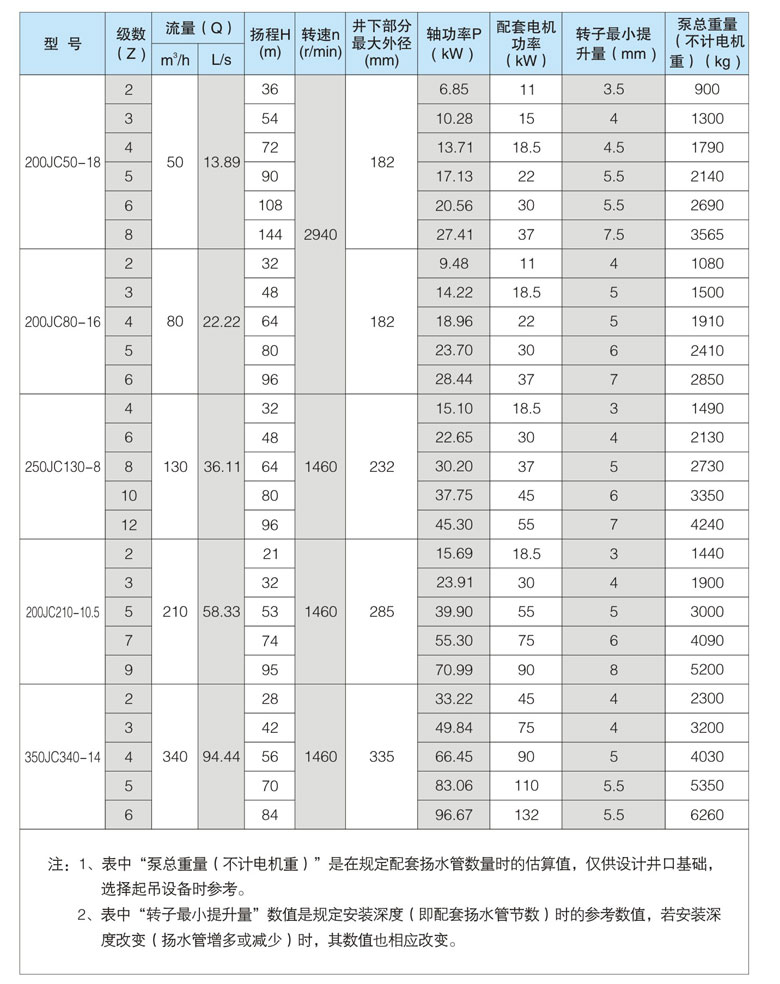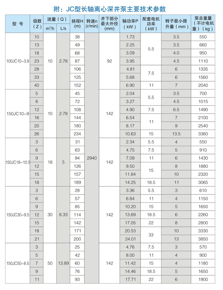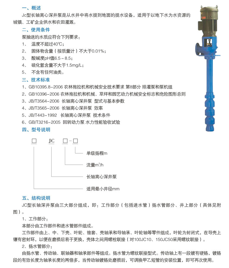 Jc型长轴离心深井泵是从水井中将水提到地面的提水设备,适用于以地下水为水资源的城镇、工矿企业供水和农田灌溉。